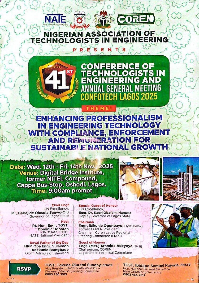 Join us at CONFOTECH Lagos 2025, a premier gathering hosted by the Nigerian Association of Technologists in Engineering (NATE). This landmark event offers a unique platform for technologists, engineering professionals, and stakeholders to engage in knowledge exchange, network with industry leaders, and shape the future of technology and development in Nigeria. Held over four days at the state-of-the-art Digital Bridge Institute, this conference promises insightful sessions, innovative showcases, and unparalleled opportunities for growth and collaboration. Don't miss the chance to be part of this transformative experience! πβ¨