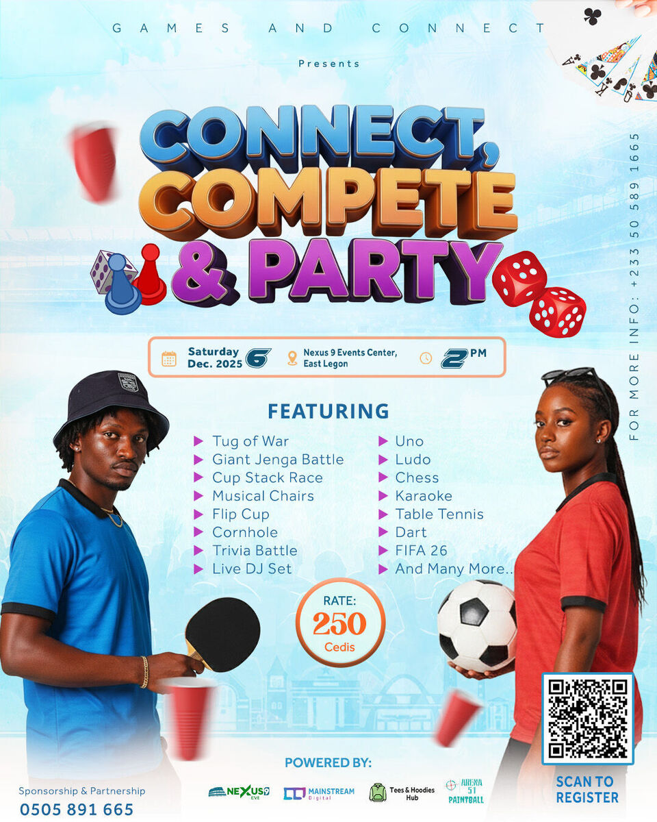 Get ready for the ultimate blend of games, fun, and party energy this December at The Tournament — brought to you by Games and Connect! Join us at the stunning Nexus 9 Events Center, East Legon, for an unforgettable afternoon filled with friendly competition, laughter, and nonstop entertainment. Whether you’re coming to compete, connect, or just vibe, there’s something for everyone!