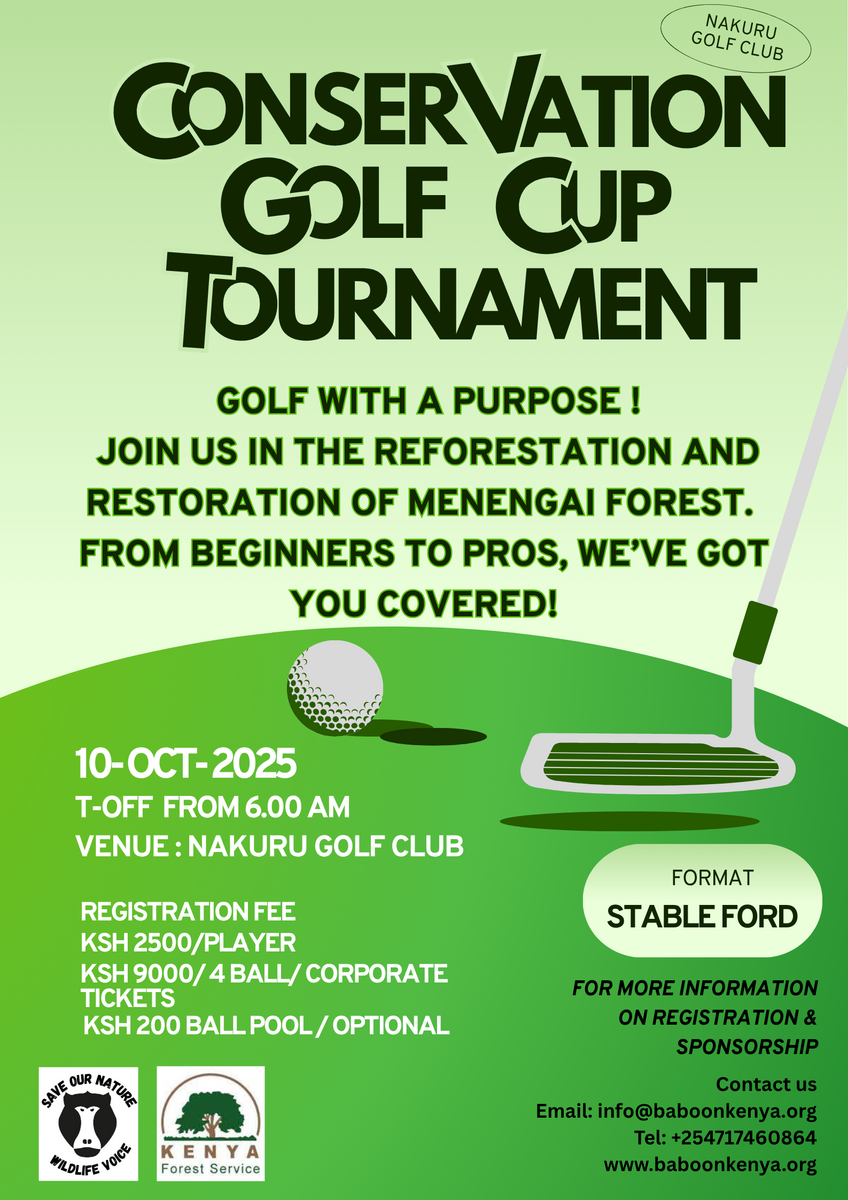 By participating in the Annual Conservation Golf Cup Tournament, you will play a pivotal role in our mission to restore and protect the Menengai Crater Forest. For registration and sponsorship opportunities, please visit our website at www.baboonkenya.org. call us on +254717460864 or email info@baboonkenya.org