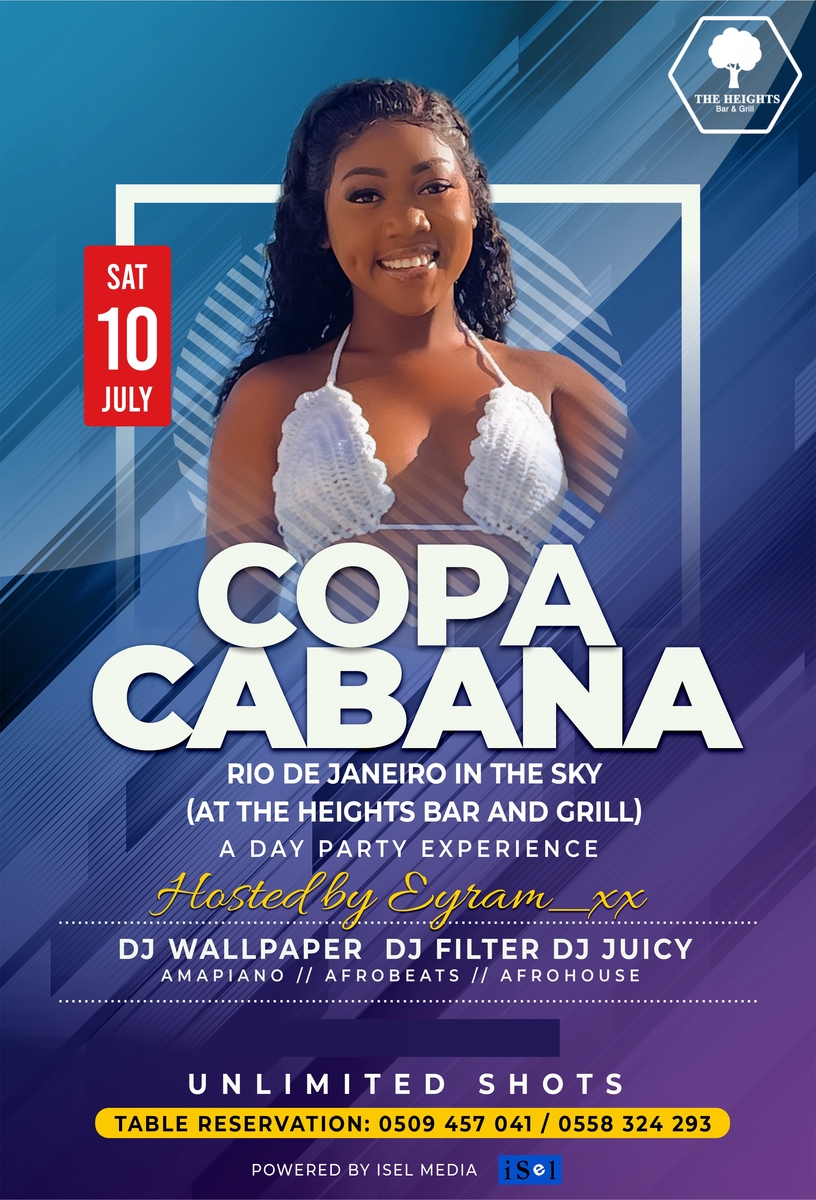 Let's party with your favorite influencers, hosted by Eyram_xx! Come in and experience a real jam! Right from the day into the night, we jammin to the craze with DJ Wallpaper, DJ Filter, DJ Juicy and others. Come through anytime as we jam in the night from 8 PM till late. There will be unlimited shots for everyone. The bar is ready to serve. Book your reservations by calling 050 945 7041. An iSel event. All Rights Reserved.