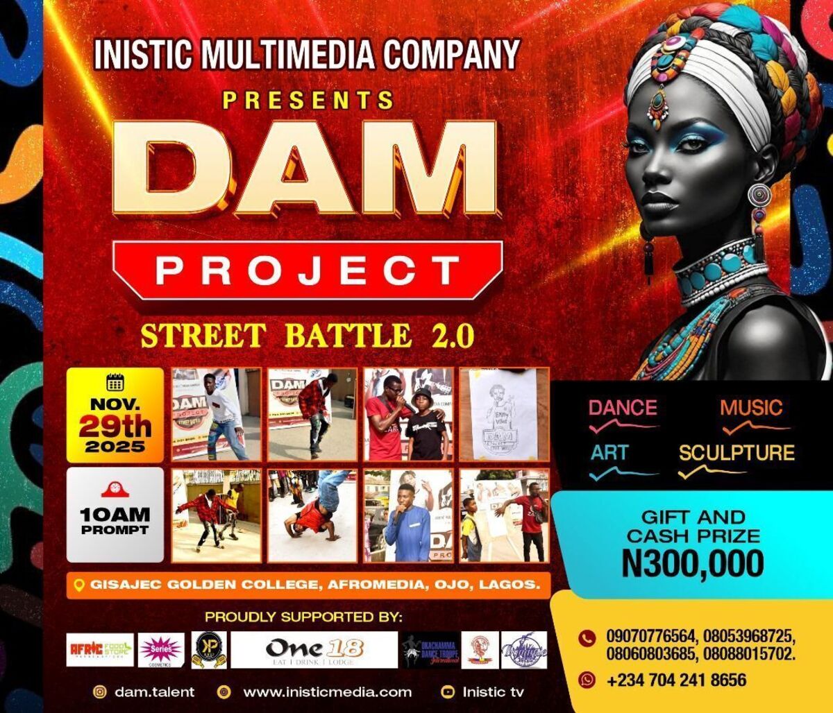 🔥 Get ready for an electrifying talent showdown! DAM TALENT BATTLE is your chance to witness jaw-dropping performances in dance, art, and music. The winner will walk away with fantastic gifts and cash prizes totaling ₦300,000. Best of all, registration is completely FREE! 🎉