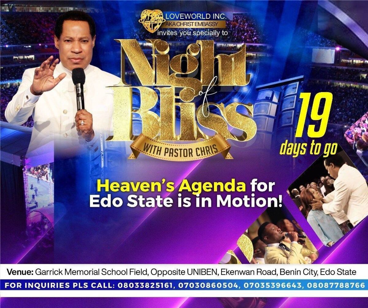 π Experience a Night of Spiritual Revival and Joy! Join Pastor Chris Oyakhilome for an inspiring Day of Bliss at Garrick Memorial Secondary School. Immerse yourself in powerful worship, uplifting sermons, and divine blessings that promise to uplift your soul. Whether you're seeking spiritual renewal or a night of fellowship, this event is designed to fill your heart with peace and joy. Come with an open heart and be prepared for a transformative experience! β¨π