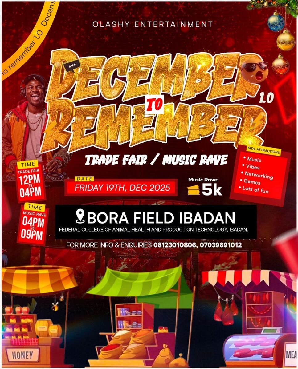 ๐ Get ready for December to Remember โ a vibrant 2-in-1 event combining a lively music rave and an engaging trade fair! This annual indigenous gathering in Ibadan is the perfect occasion for youth and young at heart to trade, network, and have fun together. Experience the electrifying atmosphere, enjoy live performances, and connect with like-minded individuals in a dynamic setting. Whether you're there to trade, dance, or simply soak up the festive vibe, this event promises unforgettable memories! ๐