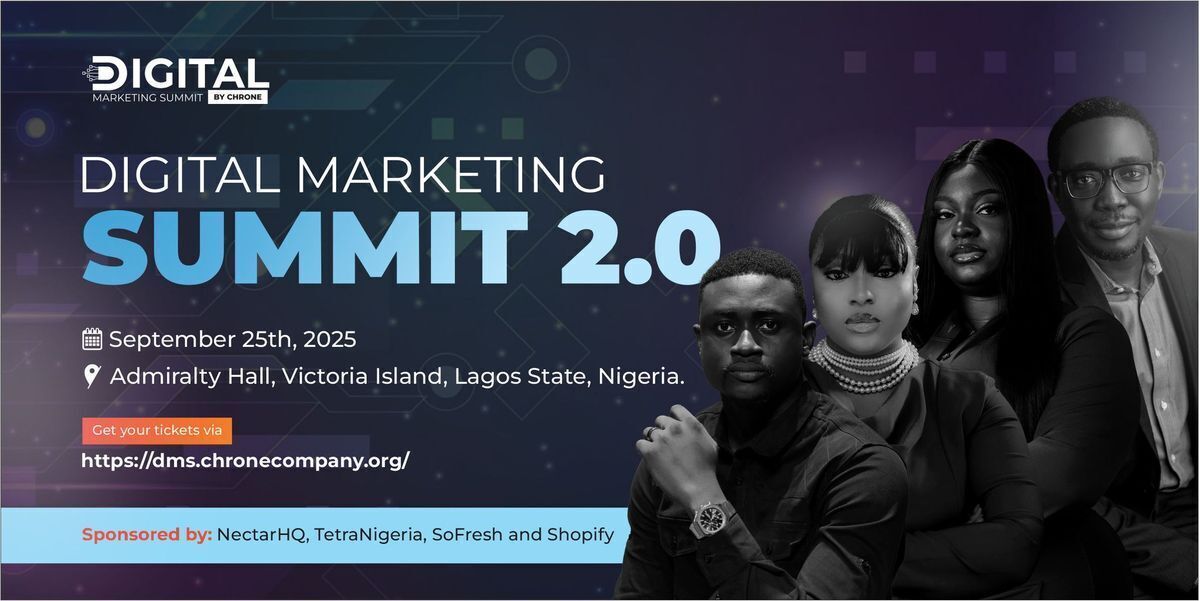 ๐ Digital Marketing Summit 2.0 is an innovative summit led by Chrone Influitive Company, bringing together over 1,000 business owners, marketers, creators, and marketing enthusiasts. Join us at the iconic Admiralty Hall, Victoria Island, to explore cutting-edge business strategies, digital marketing insights, and industry trends. Whether you're looking to network with industry leaders or learn from top experts, this event offers a valuable platform to elevate your business and marketing skills. Don't miss this opportunity to be part of a dynamic community driving digital innovation! ๐ฏ