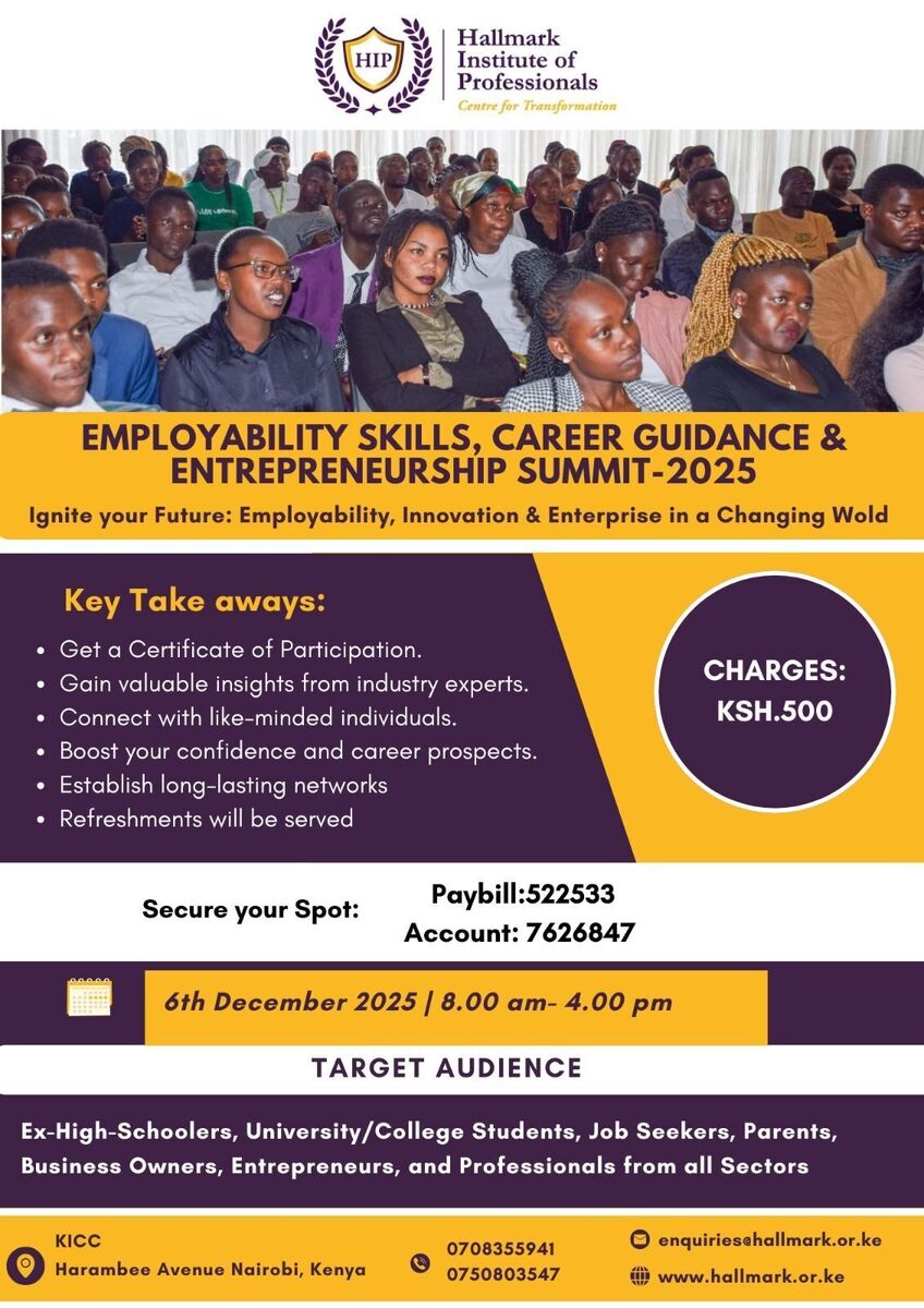 Join Hallmark Institute of Professionals for an empowering Employability Skills, Career Guidance & Entrepreneurship Summit. This dynamic event is designed to elevate your career prospects, boost your confidence, and connect you with industry leaders. Whether you're a student, job seeker, parent, or entrepreneur, this summit offers valuable insights, certification, and networking opportunities. Enjoy engaging sessions, refreshments, and the chance to learn from top professionals. Donβt miss out on shaping your bright future! π