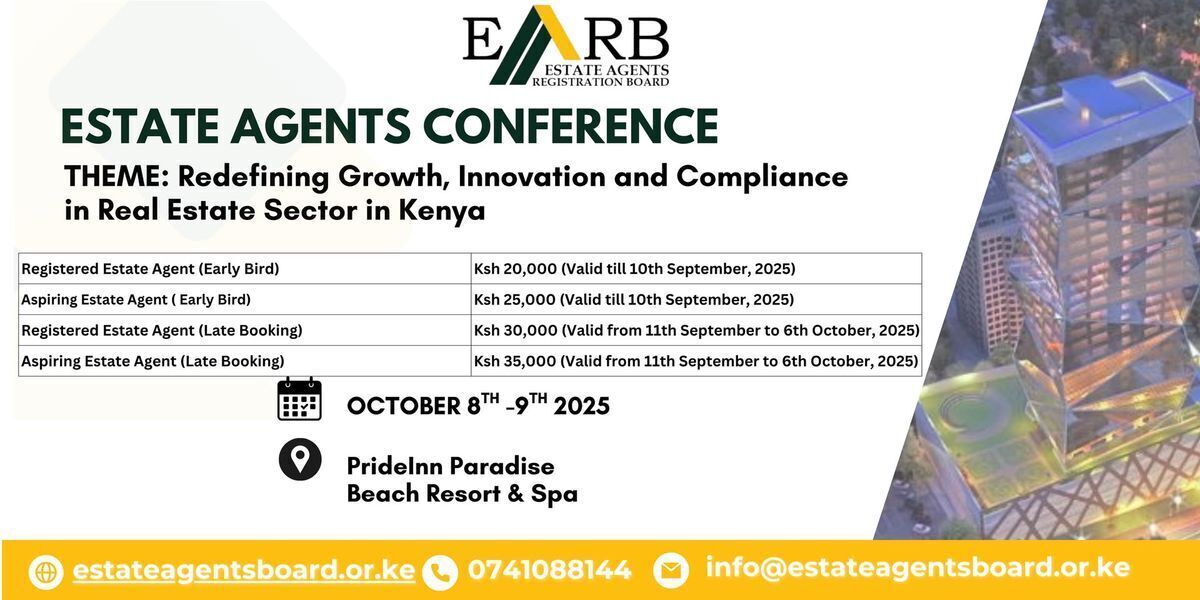 ๐ขโจ Estate Agents Conference is the premier event dedicated to redefining growth, innovation, and compliance within the real estate sector in Kenya. Join industry leaders, professionals, and enthusiasts at PrideInn Paradise Beach Resort & Spa in Mombasa for two days of insightful sessions, networking opportunities, and groundbreaking discussions. Whether you're a seasoned agent or just starting out, this conference offers valuable insights to elevate your real estate game. Donโt miss out on the chance to be part of Kenyaโs vibrant real estate future! ๐๐๏ธ