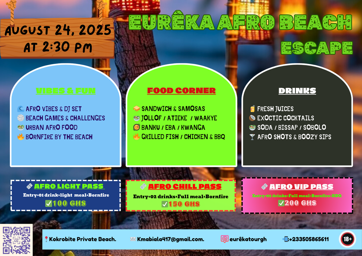 Eureka Afro Beach Escape is a vibrant beach experience at Kokrobite, blending African and Caribbean culture through live cooking, music, bonfire, BBQ, and international vibes all by the ocean from sunset till late.