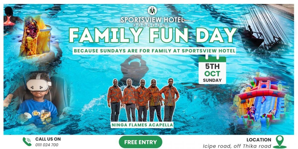 Join us for a vibrant and exciting Family Fun Day at Sportsview Hotel Kasarani! ๐โจ Experience a day filled with laughter, music, kids' amusement rides, swimming, and delicious food. This event promises unforgettable memories for families looking to enjoy quality time together amidst entertainment and thrilling activities. Whether you're into performances, kids' park adventures, or just relaxing with loved ones, this day is perfect for everyone. Donโt miss out on the fun and the chance to create beautiful moments with your family! ๐๏ธ๐ถ