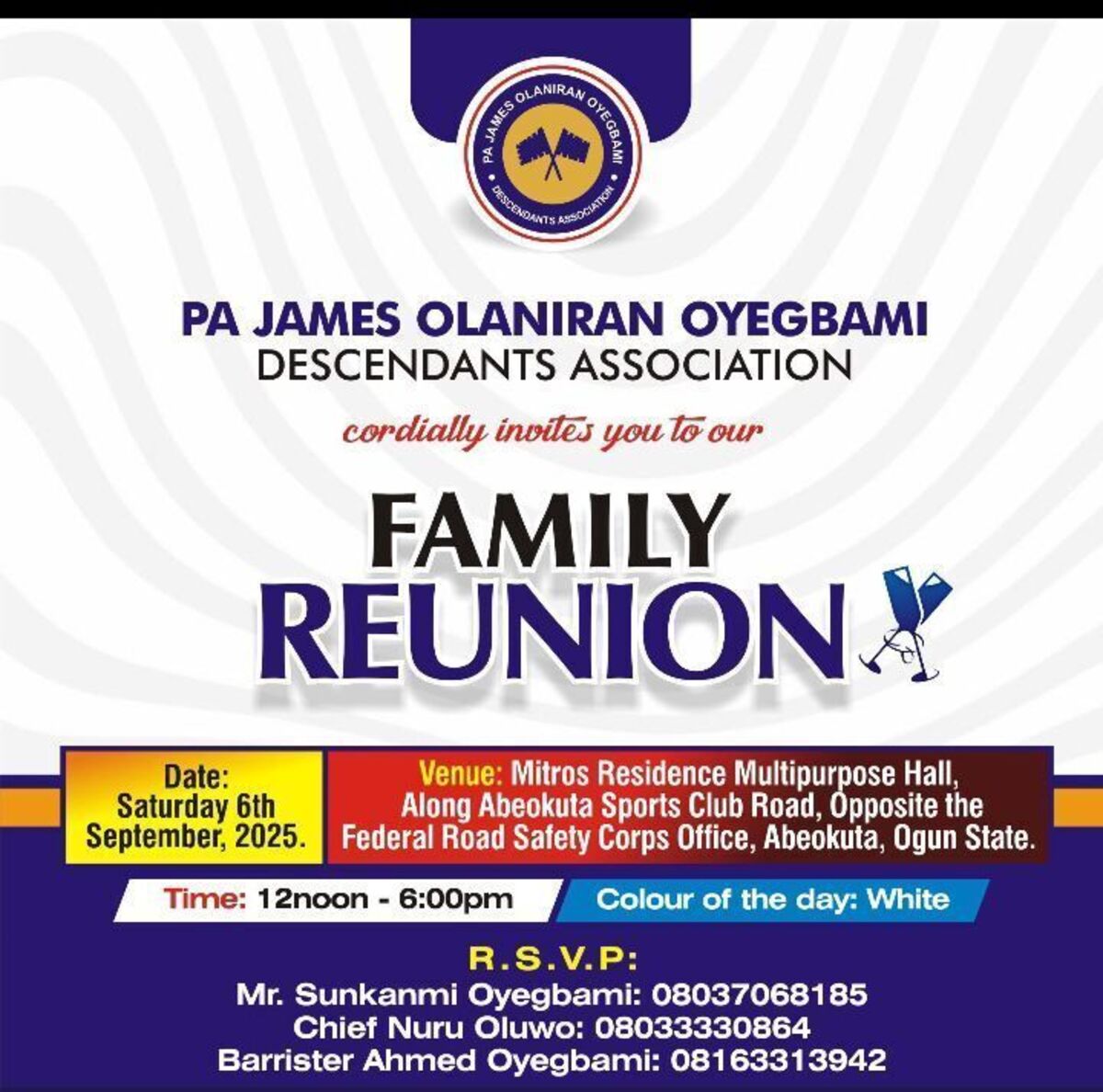 Join us for a heartfelt Family Reunion where bonds are celebrated and memories are made! 🎉 This special gathering offers an opportunity for members of the Pa James Olaniran Oyegbami Descendants to reconnect, share stories, and strengthen family ties. Enjoy a day filled with love, laughter, and togetherness at the beautiful Mitros Abeokuta. Whether you're coming from near or far, this event promises a warm atmosphere and meaningful connections. Don’t miss out on this chance to be part of a cherished family tradition! ❤️✨