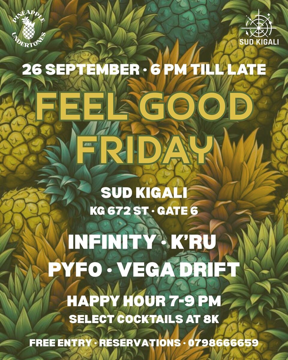 Kick off the weekend with a vibrant and energetic atmosphere at Feel Good Friday! π This lively event offers an exciting blend of music, DJ performances, and good vibes designed to lift your spirits. Hosted at Sud Kigali, it features resident DJ KβRu, guest DJs Dj Infinity & Dj Puyo, and introduces Vega Drift, promising an unforgettable night. Enjoy happy hour specials on select cocktails from 6 PM till late, and get ready to dance the night away in a fantastic setting. Whether you're looking to unwind, network, or simply have fun, Feel Good Friday is the perfect way to start your weekend! ππΊ