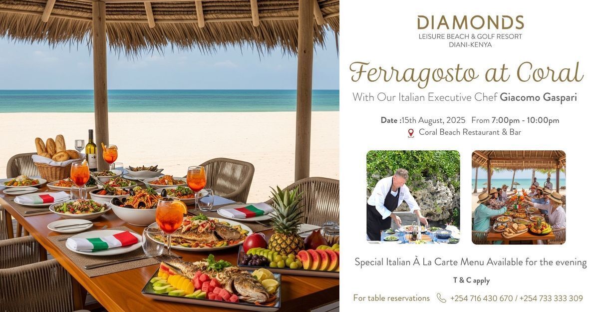 Join us for an unforgettable evening of authentic Italian flavors and seaside ambiance at Ferragosto at Coral! Hosted by our talented Italian Executive Chef Giacomo Gaspari, this event promises a spectacular celebration by the beach. Indulge in a specially curated Italian Γ La Carte Menu featuring marinated prawns, fresh seafood, juicy Tomahawk steak, and classic tiramisu π€π₯©π°. Enjoy the ocean views, live entertainment, and a vibrant atmosphere that captures the spirit of Italy along the beautiful Diani Beach. Perfect for food lovers, families, and friends looking to celebrate summer with fine dining and good company! ππ