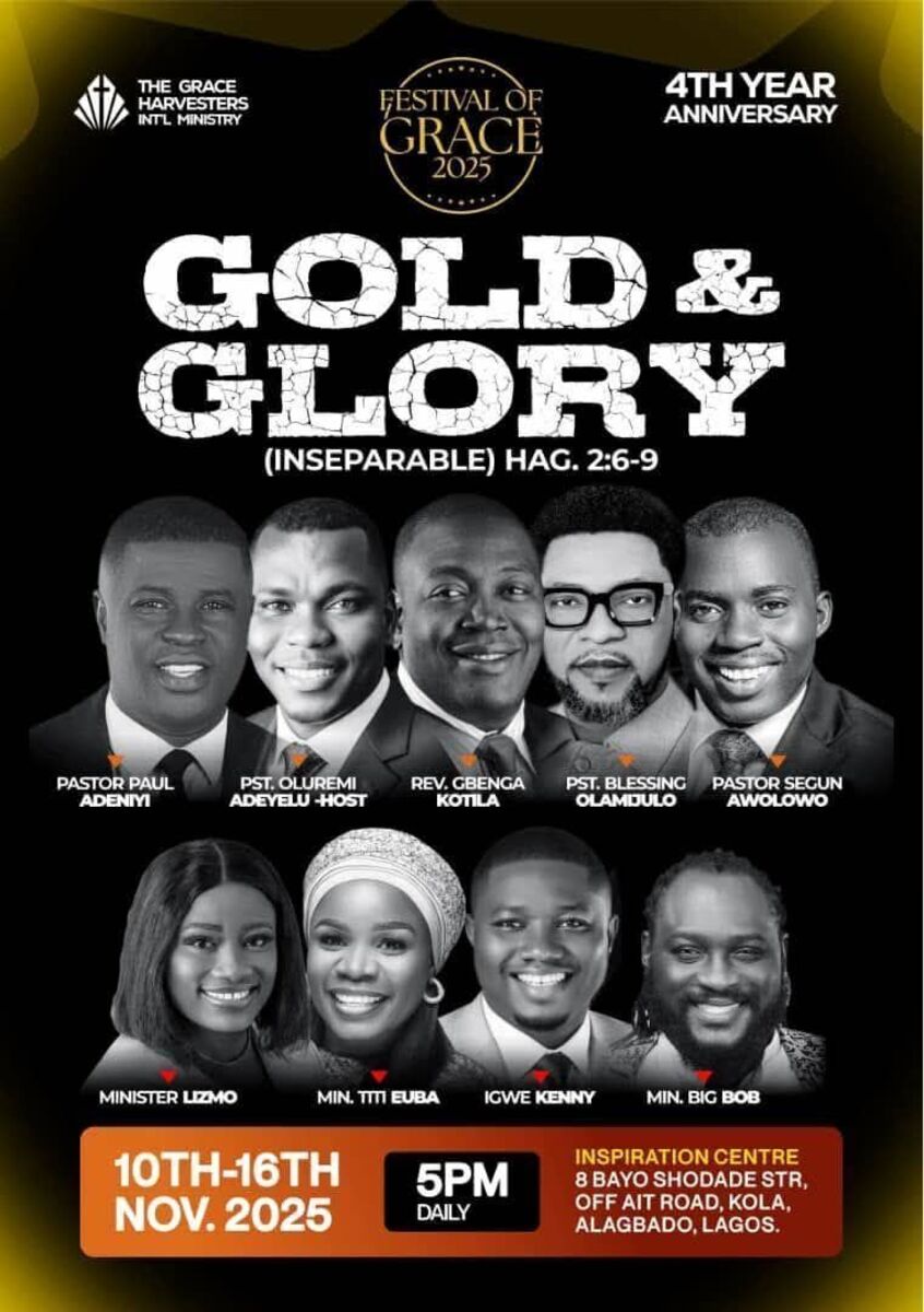 Experience a divine gathering that ignites destinies and releases heavenly treasures. The Festival of Grace 2025 is a prophetic event themed: Gold & Glory. Join us for a powerful week of impartation, revelation, and transformation, where heaven kisses earth and God's glory shines brightly upon you. Expect prophetic declarations, divine wealth, radiant honor, and a life reflecting His brilliance. Come hungry for more and leave empowered to walk in glory! β¨