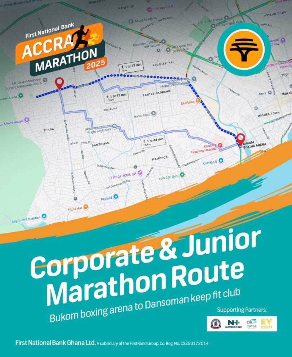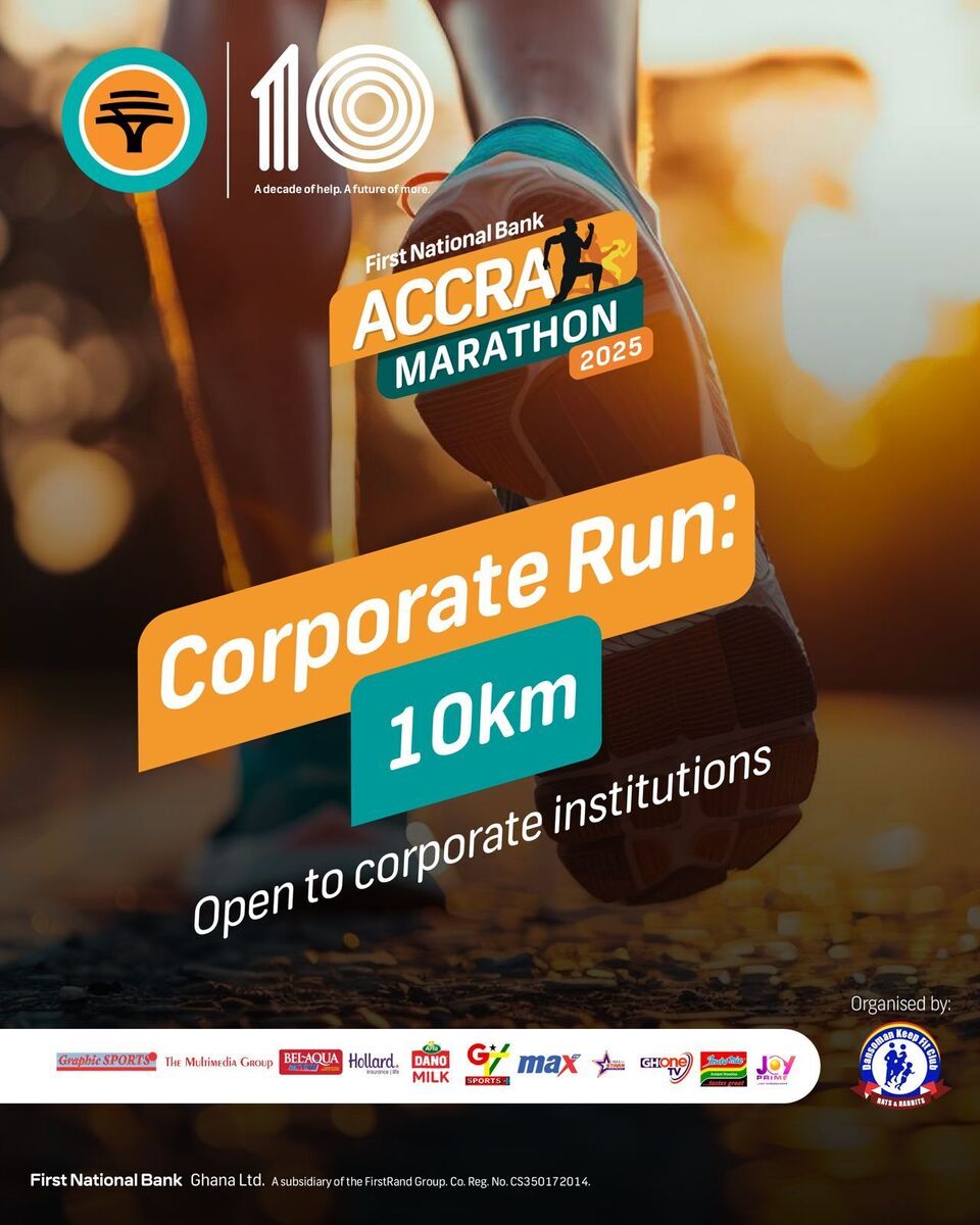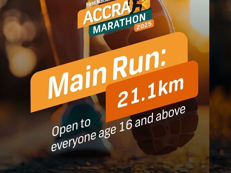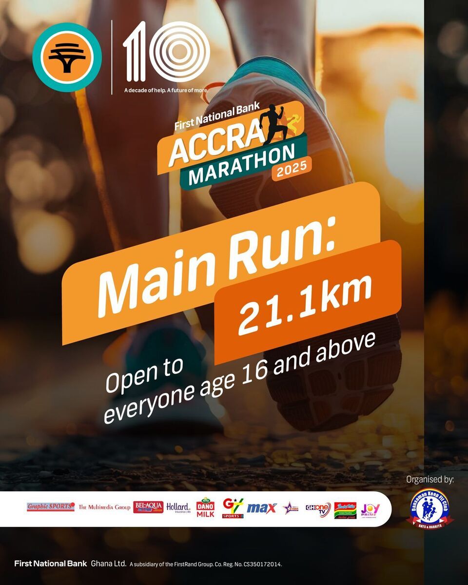 First National Bank Accra Marathon is the most prolific marathon in Ghana . The marathon ( previously known as the Accra Milo Marathon is an offspring of the Dansoman Keepfit club . There are 3 categories of run including ; Mass run - 21.1km. Junior run and Corporate 10km .