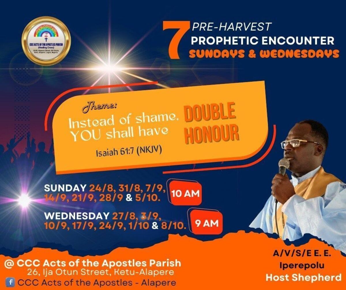 Experience the first Wednesday of a transformative seven-week Pre-Harvest Prophetic Encounter series. This event promises an impactful session filled with prophetic declarations, divine breakthroughs, and testimonies that will uplift your spirit. Whether you're seeking spiritual renewal or a fresh touch from God, this is an opportunity you can't afford to miss! π