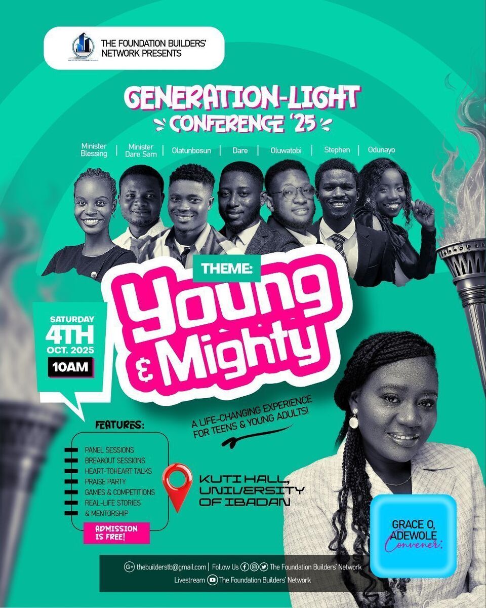 🌟 Generation-Light Conference 2025 is set to ignite the hearts of young people in Ibadan and beyond! This vibrant gathering is crafted to empower teens and youths with impactful sessions, inspiring speakers, and engaging activities that foster holistic growth. Expect electrifying praise parties, fun-filled games, practical breakout sessions, and mentorship on academics, careers, relationships, and purpose. Whether you're a student, young professional, or a youth leader, this event promises an unforgettable experience full of inspiration and connection. Plus, it's streaming live for those outside Ibadan! 🎉✨