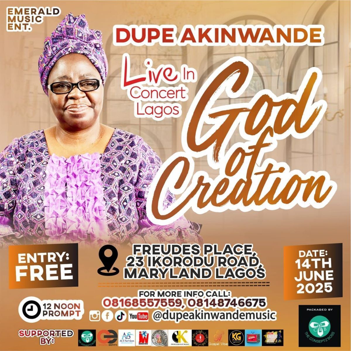 Get Ready For This Unforgettable And Encounter With The GOD OF CREATION π₯π₯π Join us for an unforgettable live concert experience with Minister @musicdupeakinwande πΆπ΅ Live in Concert Lagos! π³π¬ Date: 14th June 2025 π Time: 12noon prompt π Venue: Freudes place, 23 Ikorodu road Maryland Lagos π’ Entry: FREE π Come With An Expectation To Encounter With The GOD Who Created The Whole Universe ππ For More DetailsβοΈ 08168557559 // 08148746675 Brought To You By @emeraldmusicofficial And Packaged by @theconseptzboss π