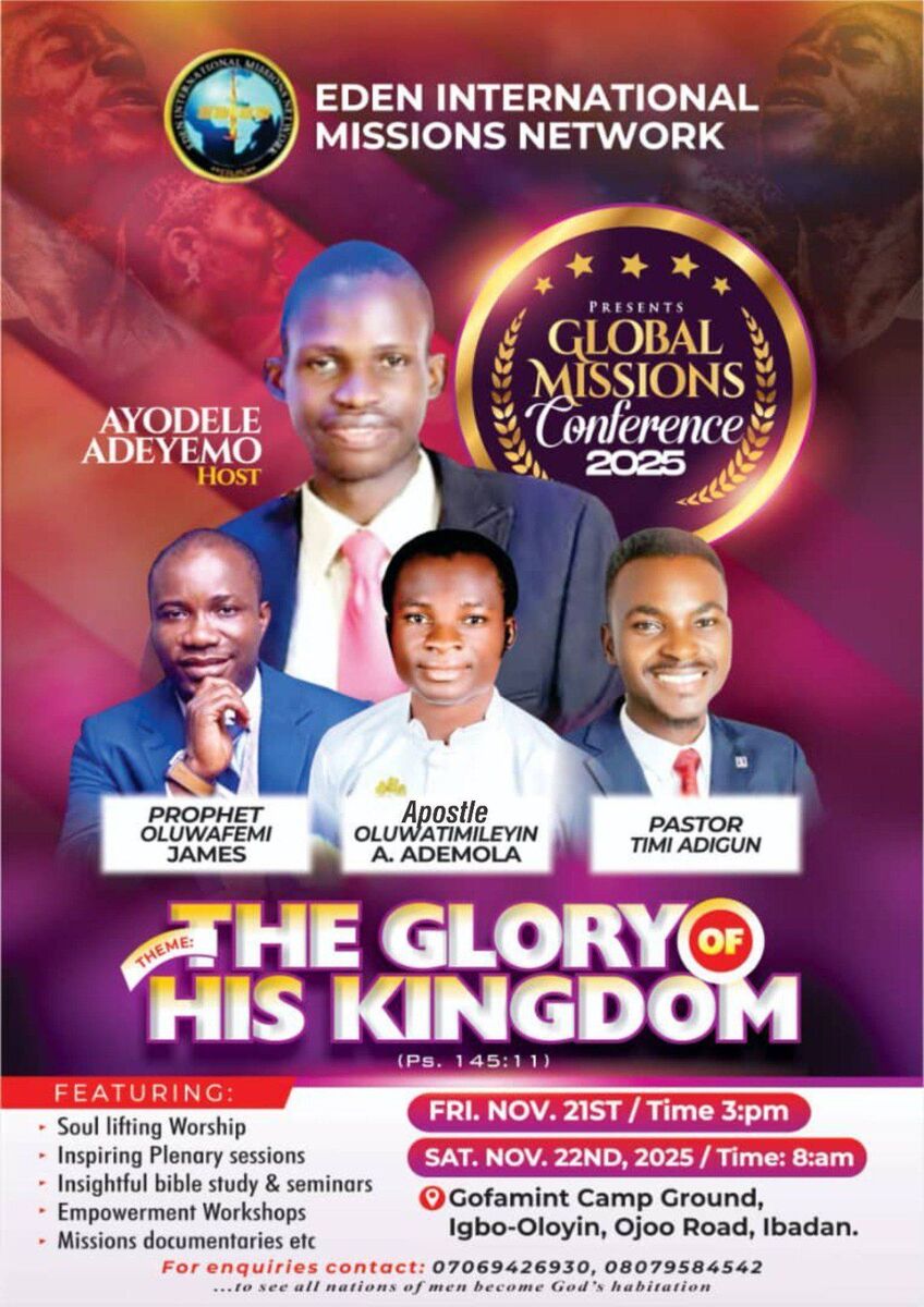 Join us for the Global Missions Conference, a vibrant gathering of believers committed to spreading the Gospel worldwide. Experience inspiring teachings, powerful worship, and impactful sessions designed to equip and motivate you for the great commission. The theme, the Glory of His Kingdom, draws from Psalm 145:11, encouraging attendees to speak of God's majestic kingdom and His mighty power. ๐โจ Whether you're passionate about missions or seeking spiritual renewal, this event promises a transformative encounter. Don't miss this opportunity to be part of a global movement and elevate your faith journey! ๐๐