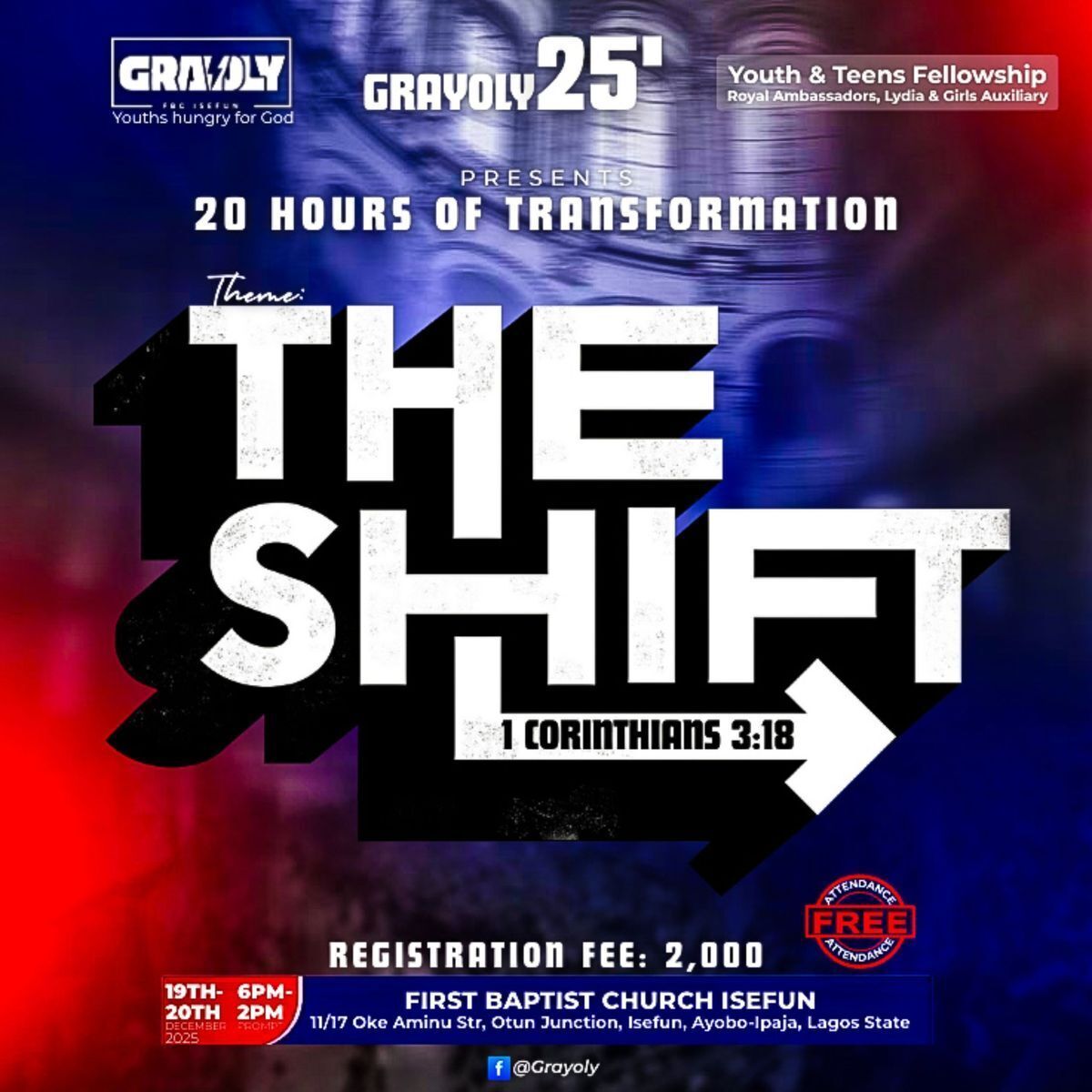 Join us again in 2025 for an inspiring gathering of youth and teenagers dedicated to refocusing this generation back to God. GRAYOLY 25': THE SHIFT promises a transformative experience filled with prayer, Bible study, worship, drama, and powerful teachings designed to uplift and empower young people. π