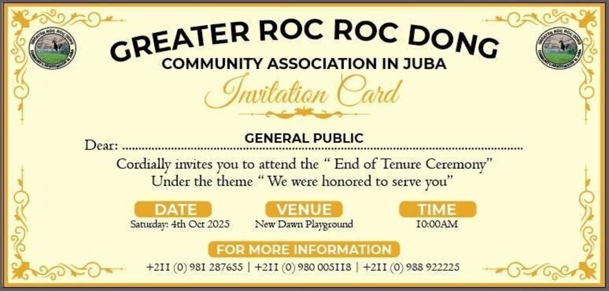 π Join us in celebrating leadership! This special event marks the outgoing leadership of the Greater Roc Roc Dong Community Association in Juba. An occasion to honor past leaders and welcome new ones, fostering community spirit and unity. Expect inspiring speeches, community bonding, and a chance to connect with local leaders and members. Donβt miss this opportunity to be part of a vibrant community gathering! π