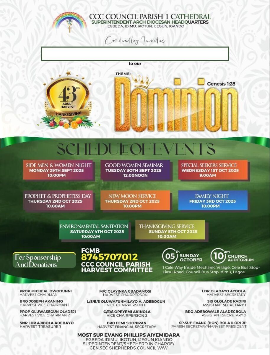 Join us for a spiritual and joyful celebration at the Harvest of Dominion event! ๐ This is a special invitation for everyone to witness the 43rd Adult Harvest Thanksgiving organized by Ijo Mimo Council Parish 1. Experience a day filled with worship, fellowship, and gratitude as we come together to give thanks and celebrate divine blessings. Expect inspiring praise, impactful sermons, and a warm community atmosphere. Donโt miss this opportunity to be part of a memorable spiritual gathering that renews your faith and spirit. Bring your loved ones and share in this blessed occasion! ๐โจ