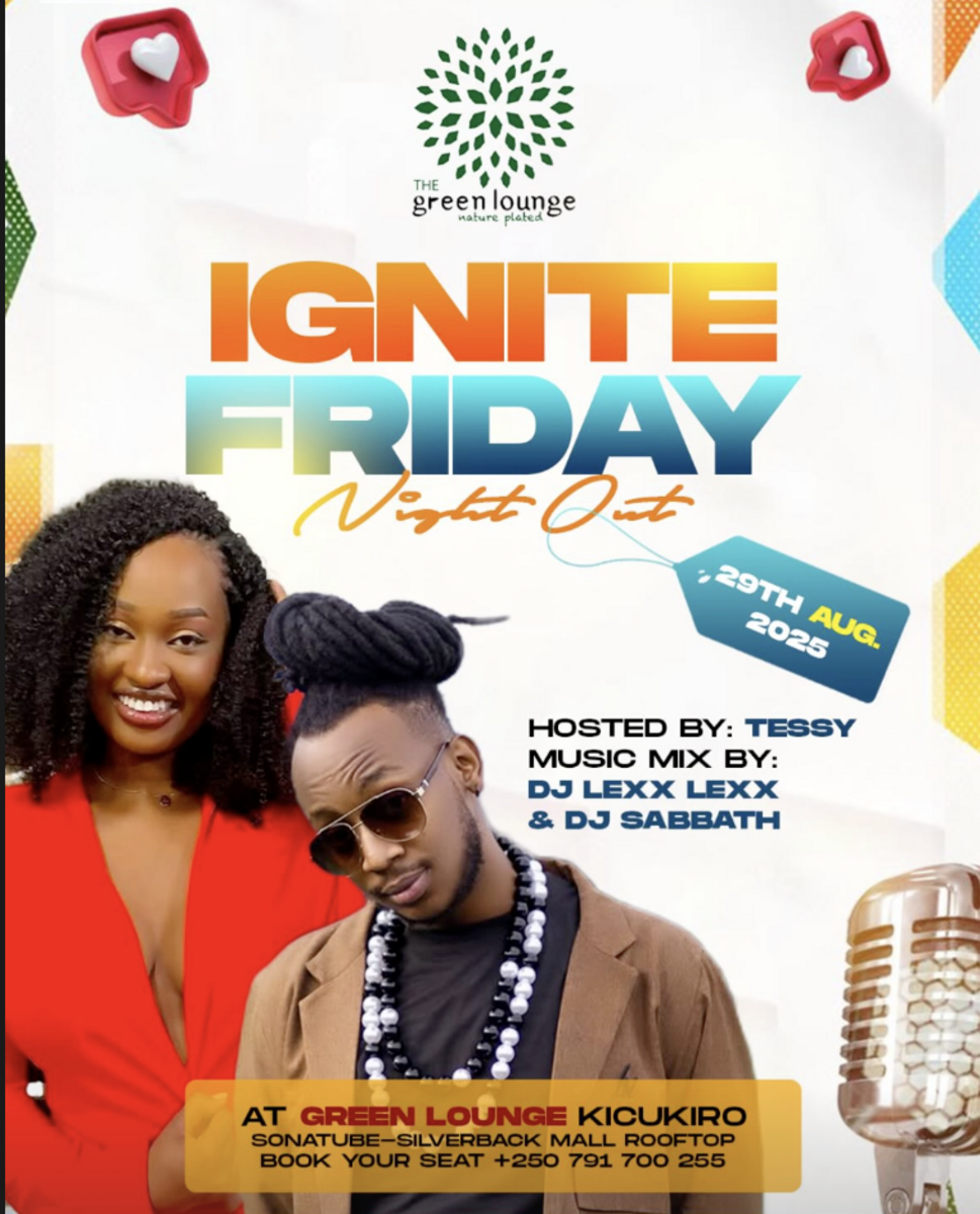 Kick off your weekend with an electrifying energy boost! Join us at The Green Lounge for a vibrant evening filled with great music, lively ambiance, and amazing company. Experience the rooftop atmosphere at Silverback Mall, Kicukiro—perfect for dancing, socializing, and making unforgettable memories. Whether you're here for the beats or the good vibes, this event promises an exciting night out. Don't miss out on the ultimate weekend starter! 🎉🎶