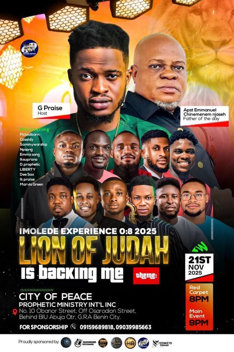 π€β¨ Experience an unforgettable night in Benin City with IMOLEDE EXPERIENCES 0:8 2025! Join us for an evening filled with worship, praise, and spiritual upliftment. This event promises a vibrant atmosphere of devotion and celebration, where community and faith come together in harmony. Whether you're seeking inspiration or looking to connect with like-minded individuals, this is the place to be! Don't miss this powerful night of worship and praise that will leave you renewed and blessed. ππ