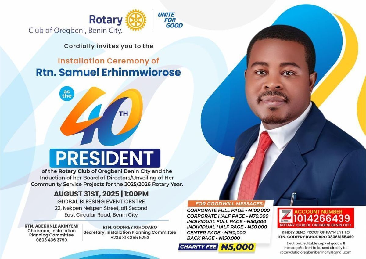 We are thrilled to invite you to witness the installation of the 40th President of the Rotary Club of Oregbeni Benin City! This prestigious event marks a new chapter of leadership and service in our community. Expect an inspiring ceremony filled with camaraderie, recognition, and celebration of service excellence. π
