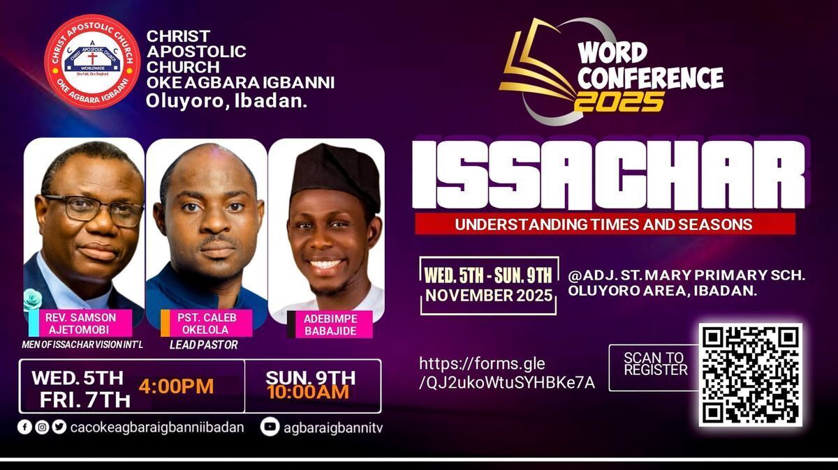 Join us for the Word Conference 2025 at CAC Oke Agbara Igbanni Ibadan. This event is inspired by the biblical example of Issachar, a tribe renowned for their understanding of the times and seasons. Discover how to discern the divine timing in your life and the world around you. Deepen your spiritual insight and learn to navigate life's seasons with wisdom and clarity. π