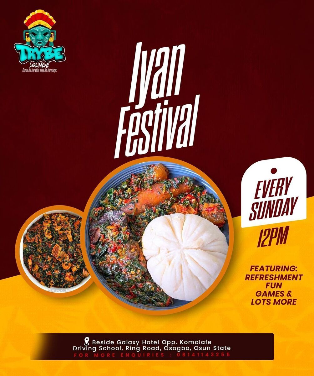 π Experience a vibrant celebration of culture and tradition at the Iyan Festival! Join us at the lively Trybe Lounge in Osogbo for a unique culinary and cultural experience. Every Sunday, indulge in the delicious taste of hot, freshly prepared pounded yam served with your favorite soups in a relaxed and energetic setting. Enjoy great food, Afrobeat tunes, and good vibes that will leave you feeling inspired and connected. Whether you're a local or a visitor, this festival promises an unforgettable day of fun, flavor, and festivity. Don't miss out on this weekly celebration of Osogbo's rich heritage! πβ¨