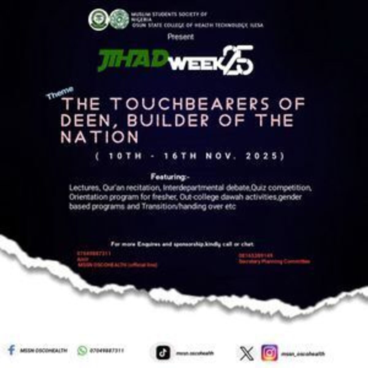 π It's that time again! Jihad Week β25 is here π₯ Theme: The Torchbearers of Deen, Builders of the Nation π 10th β 16th Nov 2025 Donβt miss out β letβs build our nation through the light of Islam π