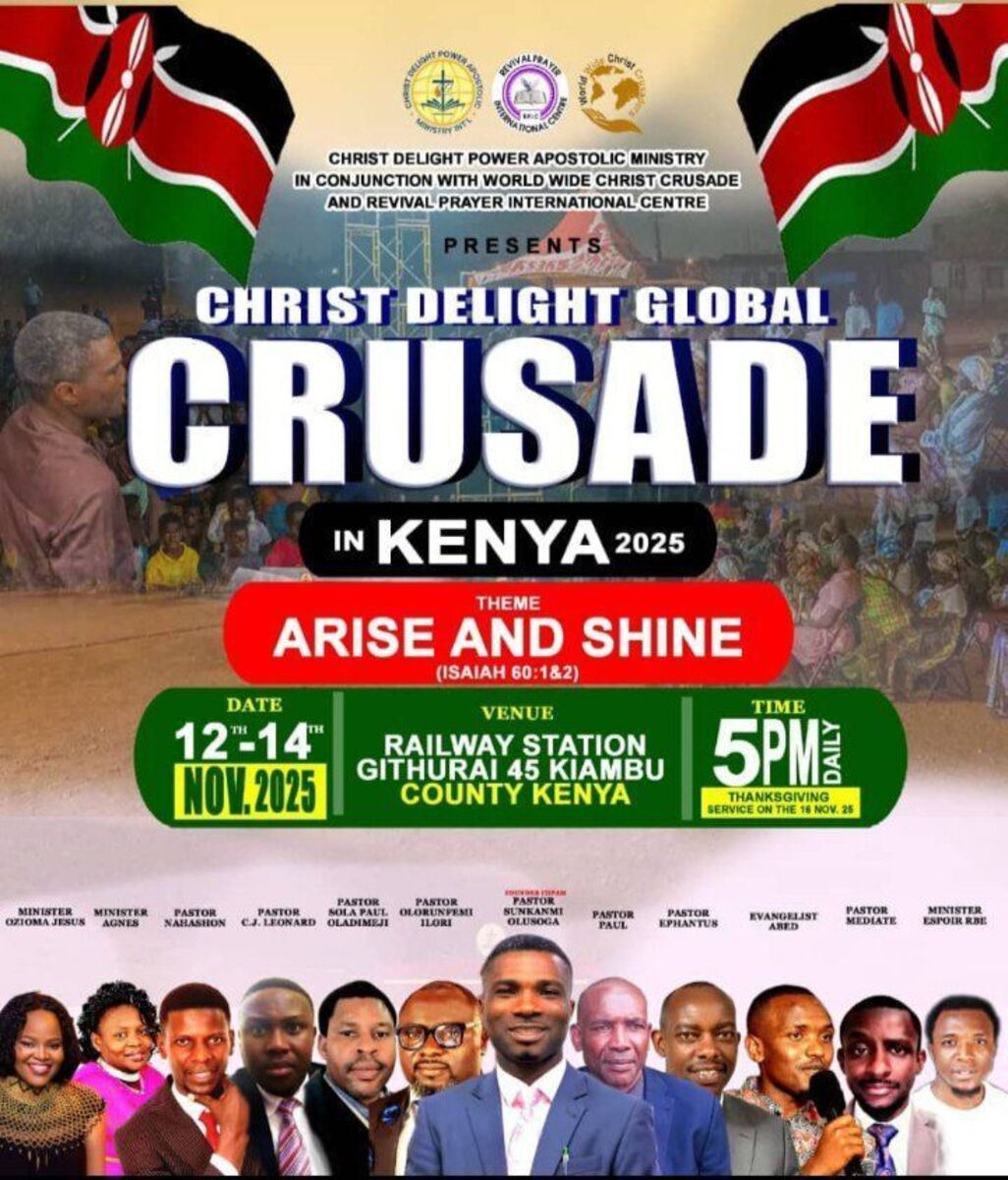 🌟 Join us for the Kenya Crusade 2025 - Arise and Shine! Experience a powerful spiritual gathering at Railway Station, Githurai 45, Kiambu County, where faith, worship, and miracles come alive. This event is designed to inspire you to arise and shine in your purpose, with daily evening sessions filled with anointed ministrations, worship, and divine breakthroughs. Don’t miss the special Thanksgiving Service on Sunday, 16th Nov 2025, as we give thanks and celebrate God's goodness. Come hungry for God’s power and prepare for an encounter that will transform your life! ✨🔥