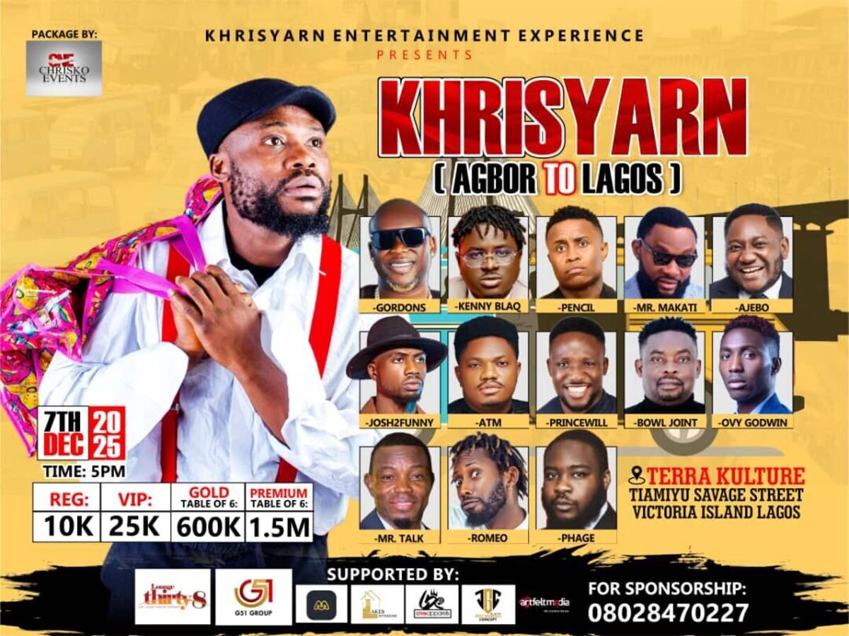 🎉 Get ready for an exciting journey with KhrisYarn as they take you from Agbor to Lagos! Experience a vibrant event filled with entertainment, comedy, and unforgettable moments. Join us for an evening of fun, music, and connection in the heart of Lagos. Don't miss out on this spectacular event designed to bring people together for a memorable celebration! 🚍✨
