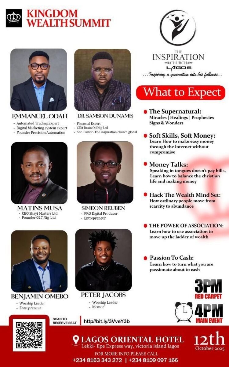 👉 Seats are limited! Register today and be part of the Kingdom Wealth Summit in Lagos — where supernatural encounters meet practical wealth strategies.
