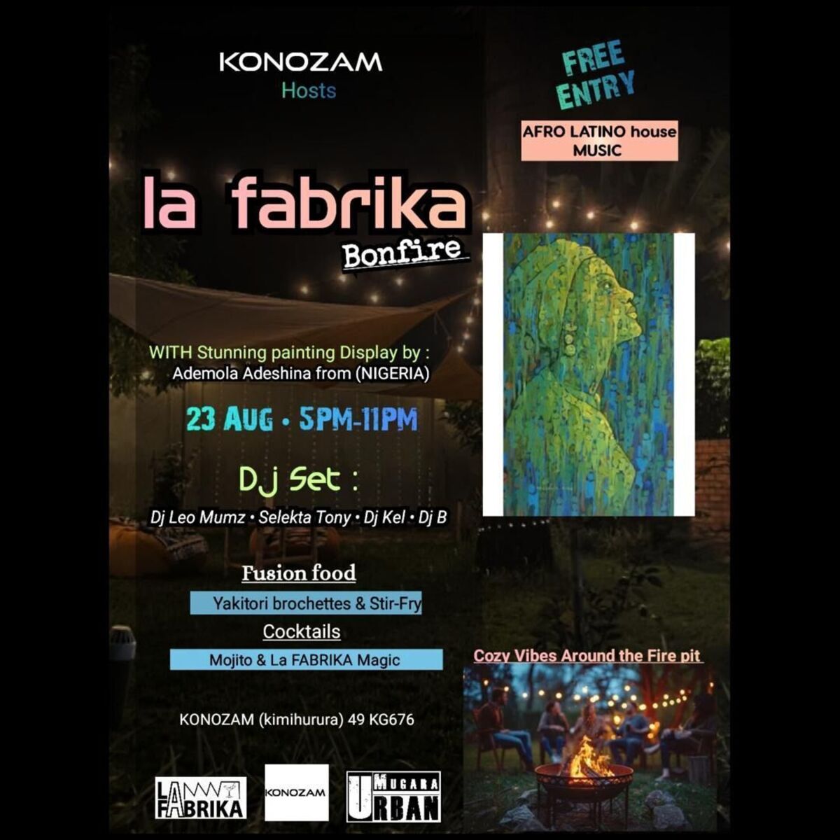 La FabriKa Bonfire is an exciting evening event held at Konozam in Kimihurura, Kigali. Join us for a vibrant night filled with lively music, captivating art displays, and delicious fusion food like Yakitori brochettes and stir-fry. Experience a special painting showcase by Nigerian artist Ademola Adeshina and enjoy cozy vibes around the fire pit. Sip on signature La FabriKa cocktails and indulge in a perfect blend of culture, food, and fun! ๐ถ๐ข๐จ๐ฅ๐น