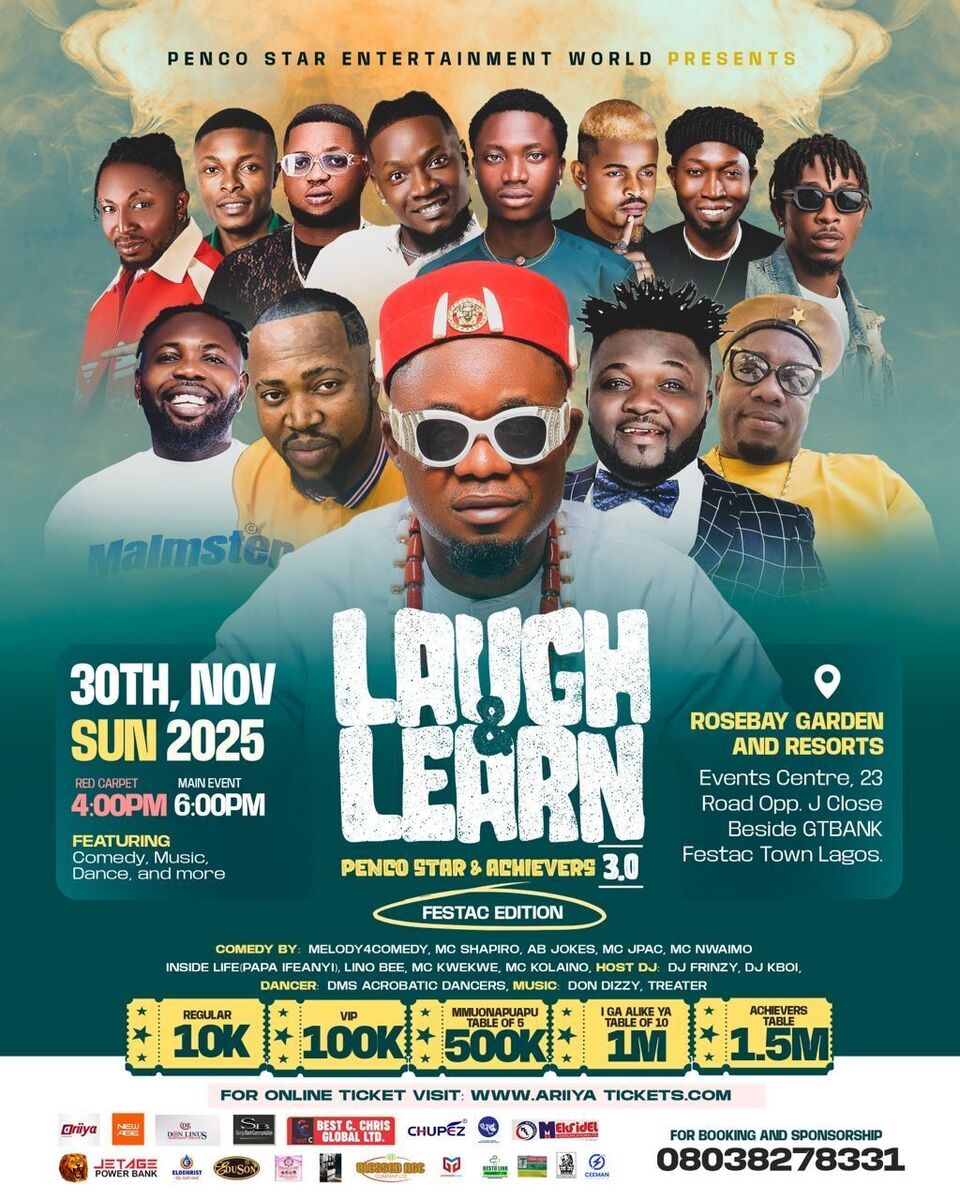 🎉 Join us for an unforgettable evening of entertainment, inspiration, and celebration! Laugh and Learn with Penco & Achivers 3.0 is a vibrant event that combines comedy, music, dance, and motivational sessions under one roof. Hosted at the beautiful Rosebay Garden and Resorts, this event promises top-notch performances from renowned comedians like Melody4Comedy, MC Shapiro, AB Jokes, MC Jpac, MC Nwaimo Inside Life (Papa Ifeanyi), Lino Bee, MC Kwekwe, and MC Kolaino. Enjoy electrifying music by Don Dizzy and Treater, energetic dance displays from DMS Acrobatic Dancers, and lively vibes from DJs Du Frinzy and Du Kboi. Plus, witness the launch of the exciting 'Penco Star & Achievers 3.0' initiative, fostering talent, creativity, and inspiration. Don't miss out on this spectacular fusion of entertainment and empowerment! 🚀