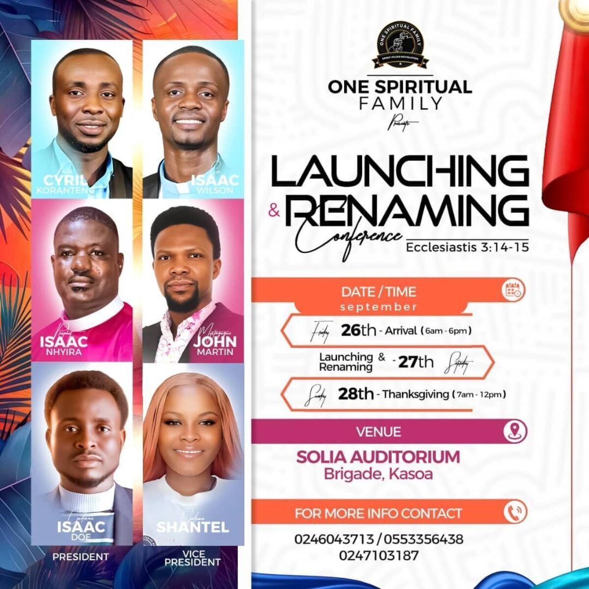 🚀Launching and Renaming Conference is set to be a transformative event! Join us as we celebrate a new chapter with inspiring leadership from a spiritual family that’s making waves. Enjoy free accommodations and free feeding—just pay only GHS 100.00 for your exclusive event T-shirt! 🎉