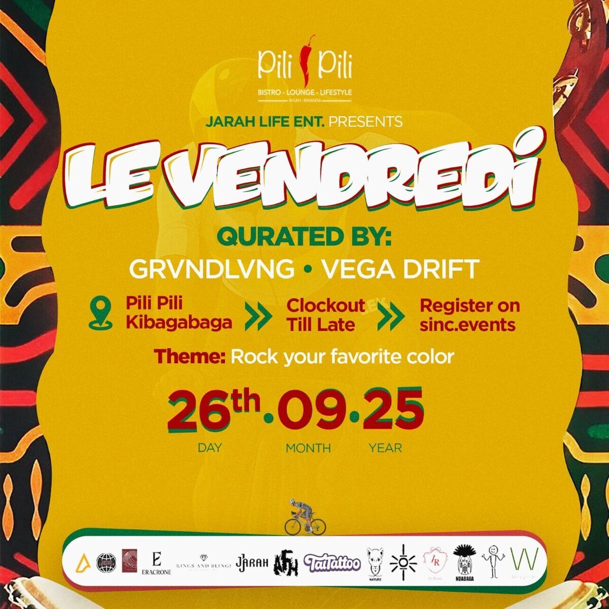Experience an electrifying Friday night at Le Vendredi, a vibrant event brought to life by Jarah Life Ent. π Get ready for an evening filled with energetic music, stylish fashion, and unforgettable moments. Hosted at the iconic Pili Pili Kibagabaga, this event promises a perfect blend of rhythm and fun, curated by renowned DJs GRVNDLVNG and Vega Drift. Dress boldly in your favorite colors and join a community that celebrates music, dance, and good vibes all night long! β¨πΆ