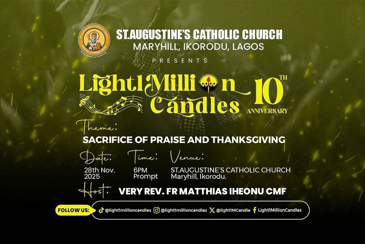 β¨ Experience a night of soulful celebration at LIGHT1MILLIONCANDLES SEASON 10! Join us at the beautiful St. Augustine's Catholic Church, Ikorodu for an evening filled with inspiring candlelight vigil, uplifting worship, and community togetherness. This event promises a serene atmosphere where spirituality and unity shine brightly. Whether you're seeking spiritual renewal or looking to connect with like-minded individuals, this is the perfect occasion. Light a candle, share in the joy, and be part of a movement that illuminates hope and faith. ππ―οΈ
