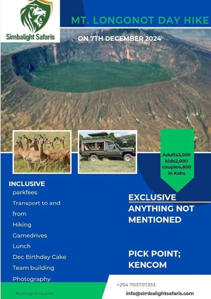 Embark on an exhilarating adventure with the Longonot Hike — a perfect day-trip escape into nature’s heart! 🌄 Whether you're a seasoned trekker or a curious explorer, this hike promises breathtaking views, fresh mountain air, and a chance to connect with fellow outdoor enthusiasts. Discover the stunning landscapes around Mount Longonot, challenge yourself on rugged trails, and enjoy a rejuvenating experience away from the hustle and bustle. 🥾✨