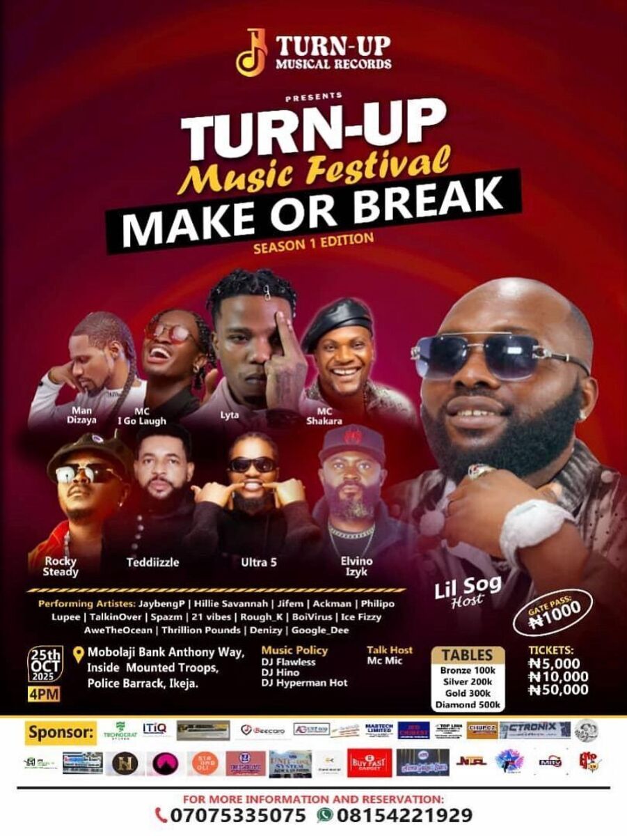 π Get ready for an exciting event! Make or Break (season1) is happening soon at Ikeja Lagos. Join us for a vibrant celebration filled with music, entertainment, and unforgettable moments. This event is perfect for fans and followers eager to experience the first edition of TurnUpFestival. Contact us for bookings and reservations to secure your spot! ππ