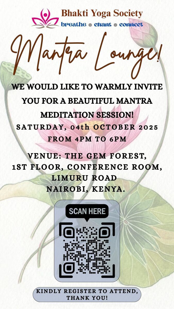 Join us for Mantra Lounge: Soulful Eveningsโan evening dedicated to music, meditation, and spiritual connection. Set in a serene ambiance at the Gem Forest Hotel, Limuru Road, this event offers a peaceful space to unwind, reflect, and rejuvenate the soul. Experience an inspiring gathering where soulful sounds meet mindful practices, creating a unique blend of relaxation and spiritual upliftment. Whether you're a returning guest or new to the journey, come and be part of this enriching experience that nurtures the heart and elevates the spirit. ๐ฟโจ