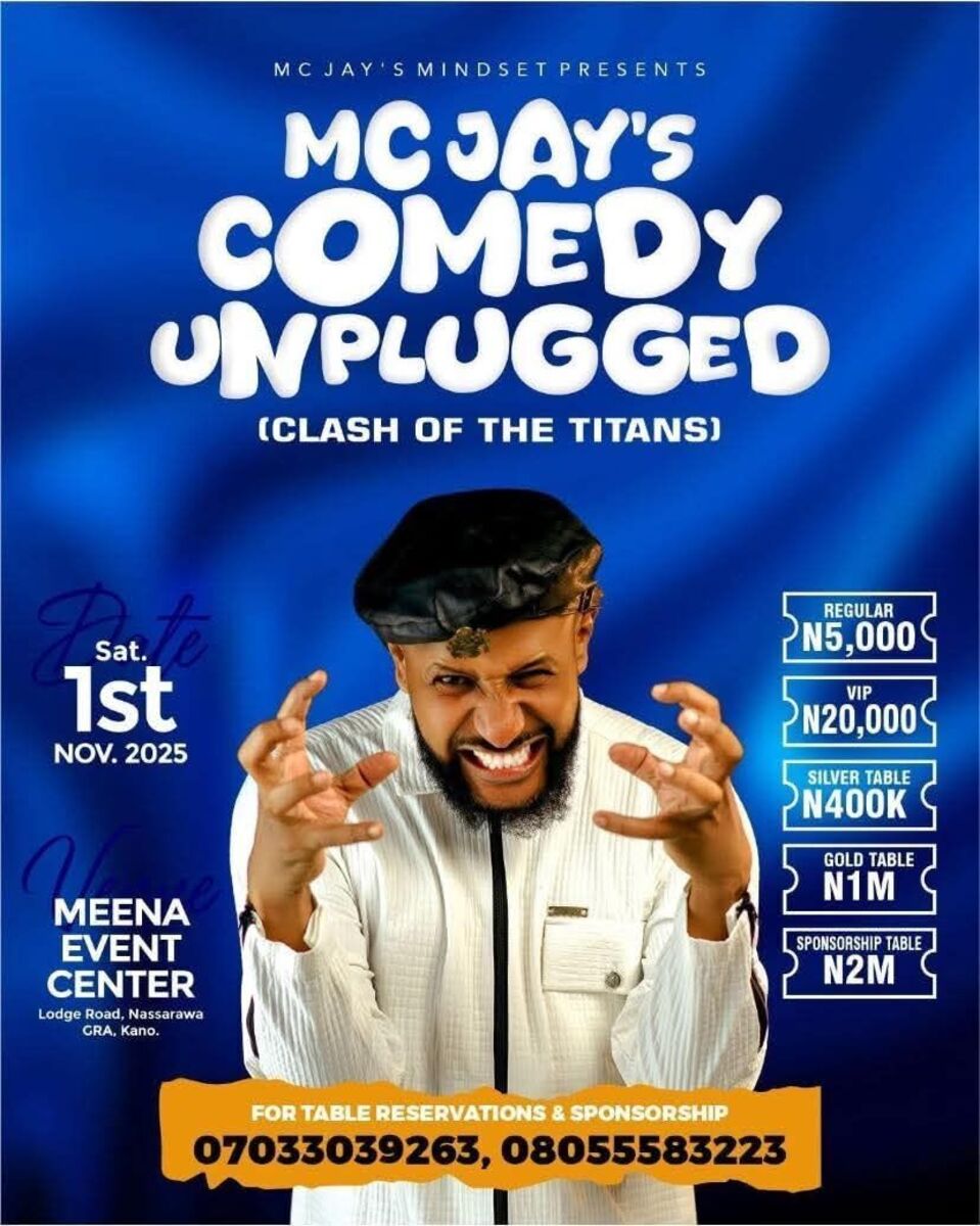 Experience an unforgettable night of laughter with Mc Jays Comedy Unplugged, one of Kano State's most popular and highly anticipated events. This year's theme, "Clash of the Titans", promises an explosive lineup of top comedians and entertainment. Join us at Meena Events Center for an evening filled with humor, fun, and great vibes. Don't miss out on early bird tickets, sponsorship opportunities, and reservations at special rates! π