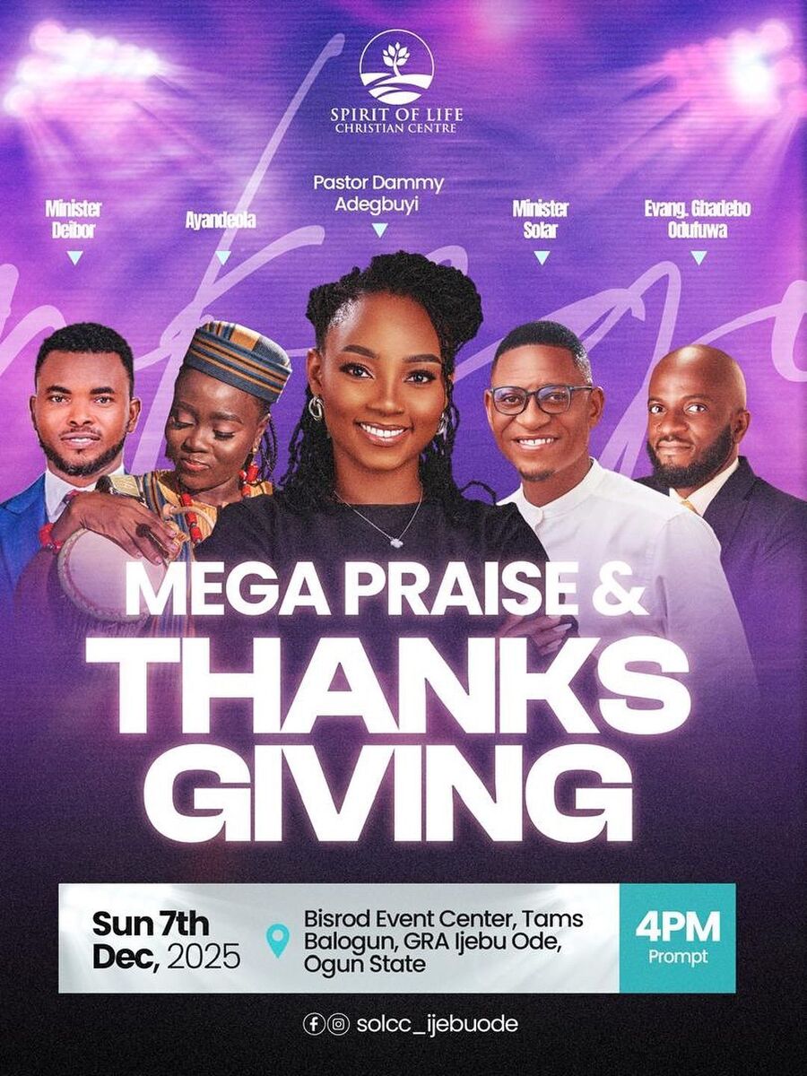 Join us for a powerful and uplifting Mega Praise & Thanksgiving Service that promises to be a spiritual boost and a celebration of gratitude. Experience an atmosphere filled with worship, joy, and community as we lift our voices in praise and thanksgiving. πΆπ