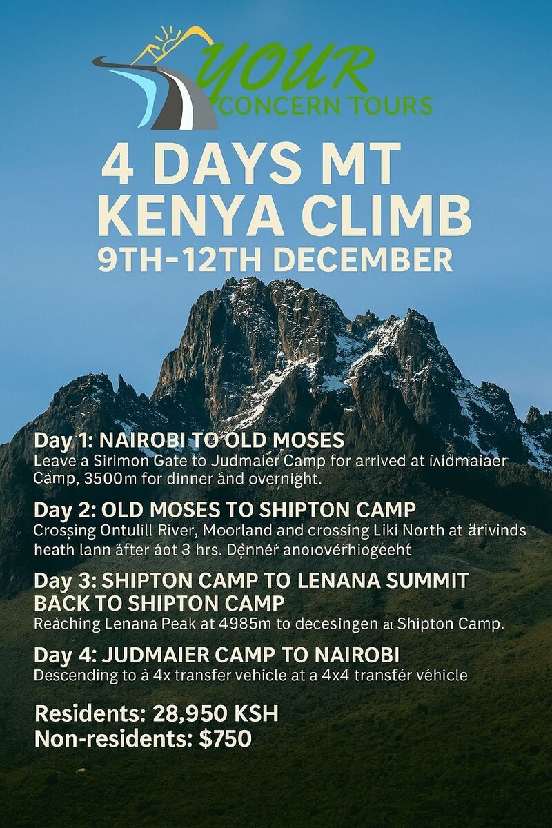 Embark on an adventurous 4-day Mount Kenya climbing safari designed for thrill-seekers and nature lovers alike! ๐ From scenic forest walks to reaching the iconic Point Lenana, this expedition promises breathtaking views, challenging treks, and unforgettable memories. Participants will enjoy guided hikes, panoramic vistas, and the camaraderie of fellow explorers. Whether you're an experienced trekker or a first-timer, this event offers a perfect blend of adventure, nature, and cultural immersion. Prepare your gear, embrace the mountain spirit, and get ready for an exhilarating journey to Africa's majestic peak! ๐งโโ๏ธโจ