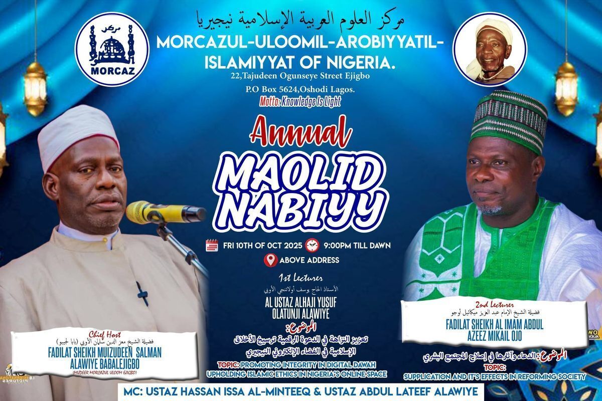 ๐โจ Join us for the 2025 Mawlid Nabiyy Celebration organized by Markazul Uloom, Ejigbo. Under the guidance of Sheikh Muizudeen Salman Alawiye Al-Iponry Baba Lejigbo, this event is a heartfelt tribute to the Noble Prophet Muhammad (S.A.W). Experience a spiritually enriching gathering with keynote lectures, recitations, and community prayers. The event aims to foster love, reverence, and unity among attendees, celebrating the birth of the Prophet in a vibrant and joyful atmosphere. Donโt miss this special occasion to connect, reflect, and rejoice in the blessings of Islam! ๐๐