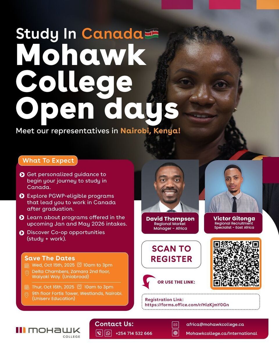 Discover the opportunity to study in Canada with Mohawk College during our exclusive Open Days in Nairobi! πβ¨ Meet college representatives face-to-face, get personalized guidance, and take the first step towards your international education journey. Whether you're interested in undergraduate programs, scholarships, or student life, this event is your gateway to a brighter future abroad. Don't miss out on this insightful and inspiring experience tailored for aspiring students in Nairobi. ππ