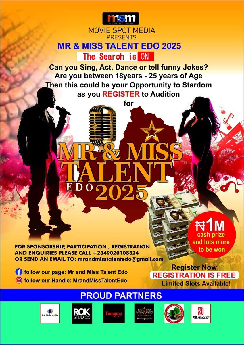 Join us for the exciting Mr & Mrs Talent 2025 Audition at the National Museum Benin City! This event is a perfect platform for talented individuals to showcase their skills and stand a chance to be crowned Mr and Miss Talent Edo 2025. Whether you're a singer, actor, dancer, or comedian, this is your moment to shine! โจ