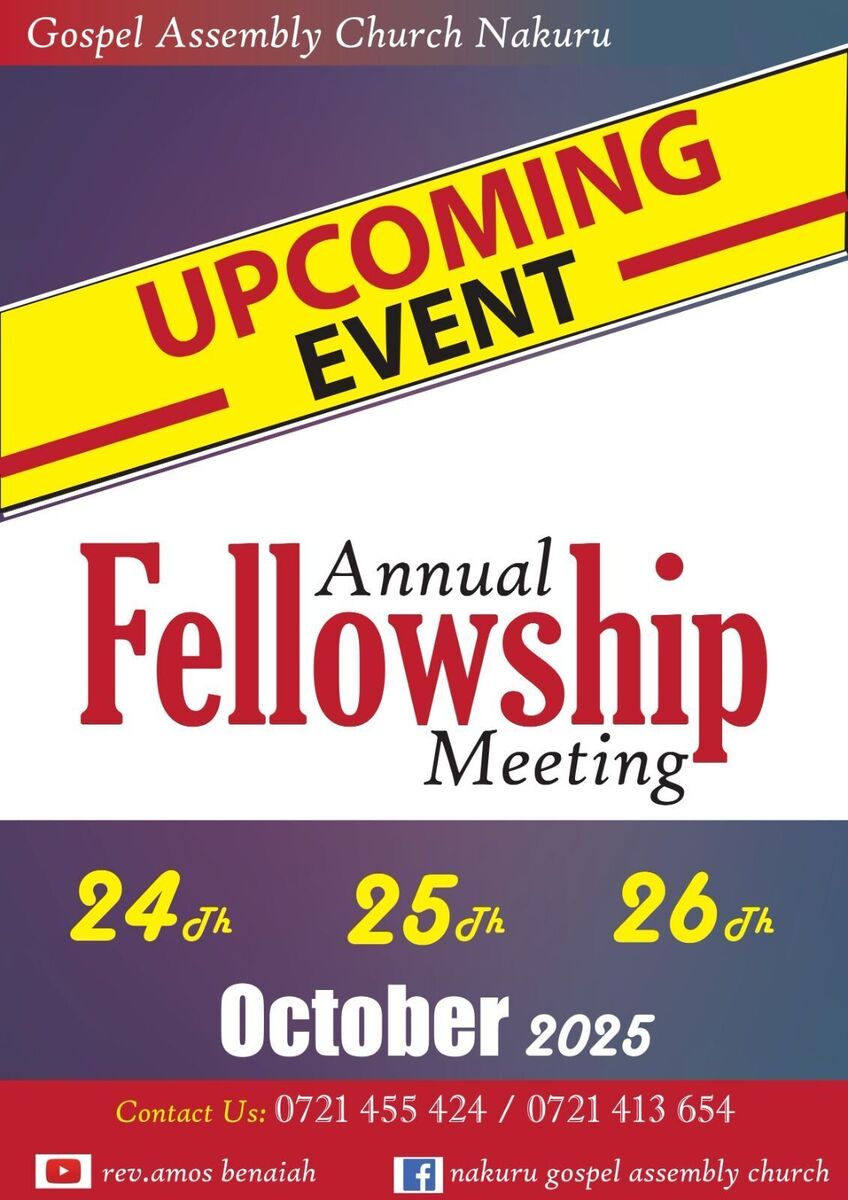 Join us for the Nakuru Annual Fellowship Meeting 2025, a soul-enriching gathering designed to edify the Body of Christ. Experience powerful worship, inspiring teachings, and fellowship with believers from across the region. This event promises a transformative spiritual encounter in a welcoming environment at the Gospel Assembly Church Nakuru. Whether you're seeking spiritual renewal or community connection, this meeting is an opportunity to grow and be uplifted. Don't miss this chance to be part of a vibrant faith-based gathering filled with hope, prayer, and fellowship! βοΈπ