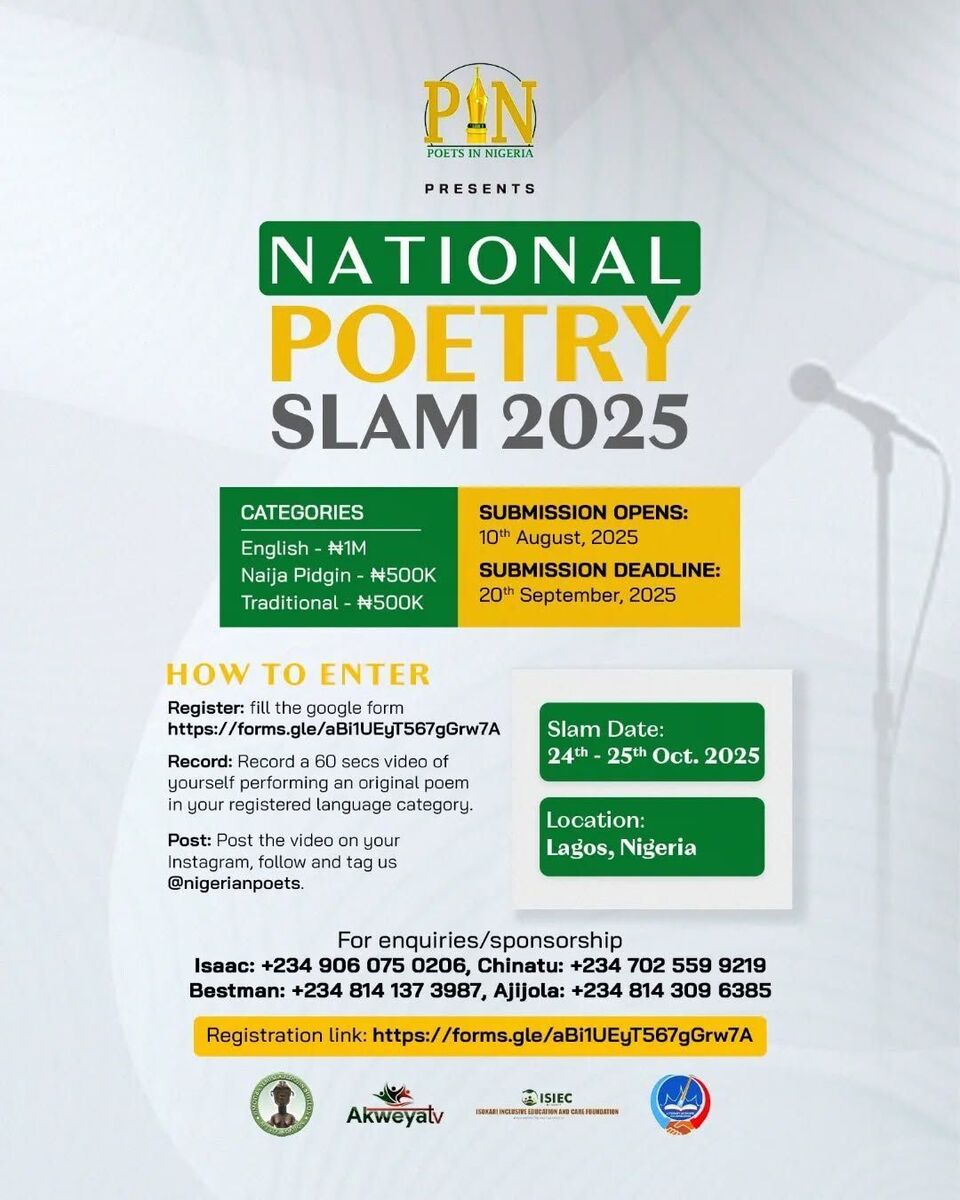 Prepare for an electrifying showcase of spoken word artistry! The National Poetry Slam invites poets from all walks to step up, slam down, and make their mark. Whether you're a seasoned poet or a passionate newcomer, this event is your stage to shine. Express your deepest thoughts, tell your stories, and connect through the power of poetry. Don't miss the chance to be part of Nigeria's vibrant spoken word scene! 🌍✨