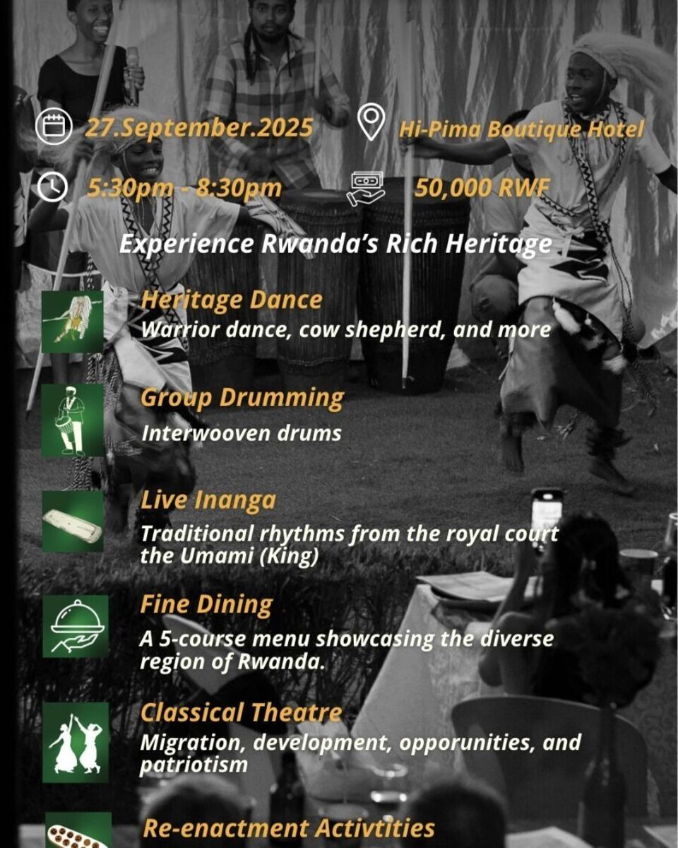 Immerse yourself in Rwanda's vibrant cultural traditions at the Night of Cultural Heritage! π This captivating evening showcases the rich tapestry of Rwandan heritage through mesmerizing dance performances, traditional music, theatrical storytelling, and exquisite culinary delights. Experience the rhythm of heritage with group drumming, witness lively re-enactments of cultural practices, and indulge in a 5-course Rwandan-inspired menu. Whether you're a cultural enthusiast or simply looking for an engaging night out, this event promises a memorable journey into Rwandaβs ancestral roots. Join us for an evening filled with tradition, artistry, and community spirit! πβ¨